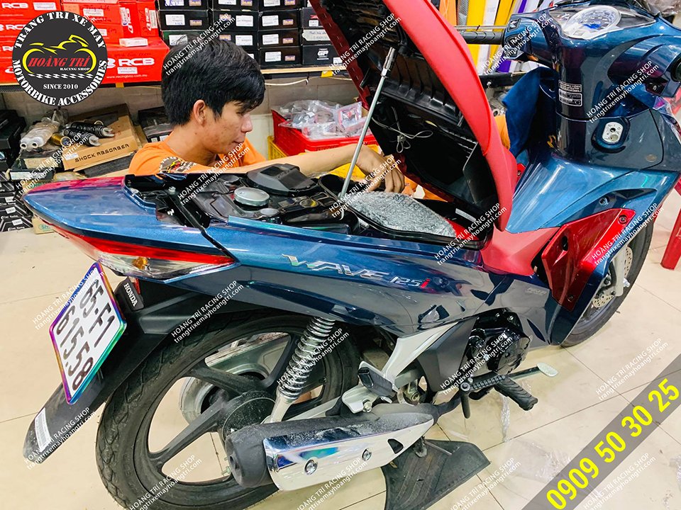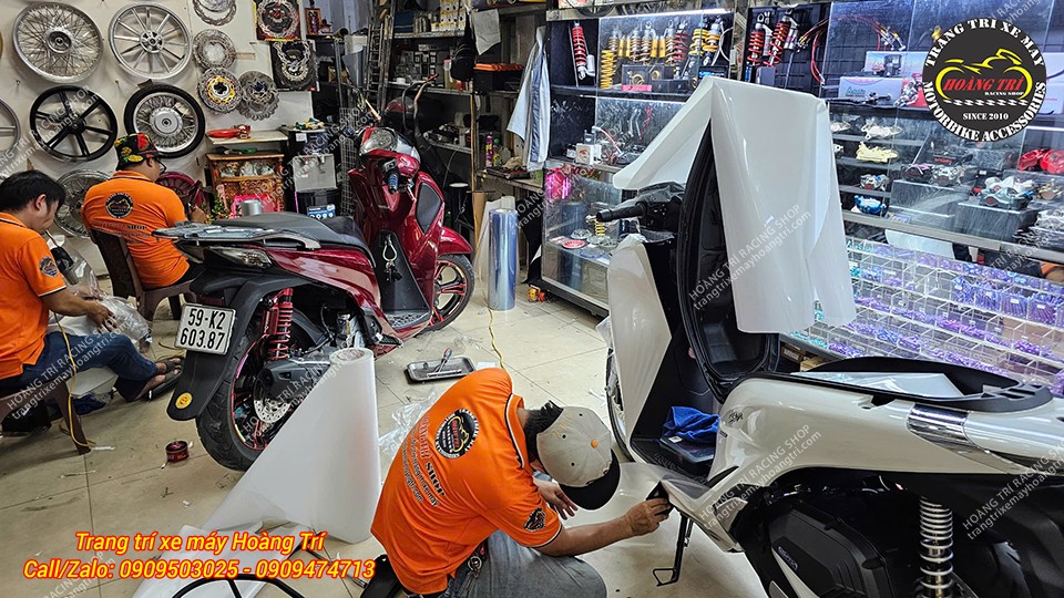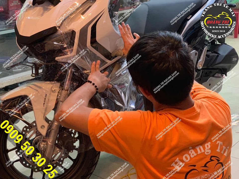 Nhân viên Hoàng Trí Racing Shop đang dán keo xe ADV 150