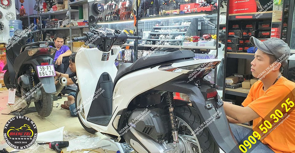 Nhân viên đang thi công dán PPF cho xe SH 2020