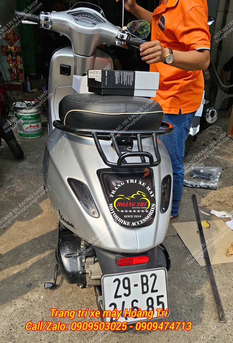 Nhân viên đang lắp đặt kính hậu Motogadget MT V2 cho xe Vespa Sprint