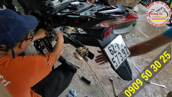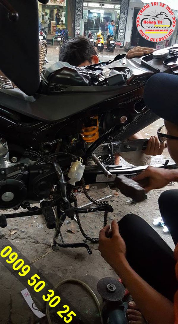 Nhân viên Hoàng Trí đang gắn phuộc sau hạ đuôi cho winner