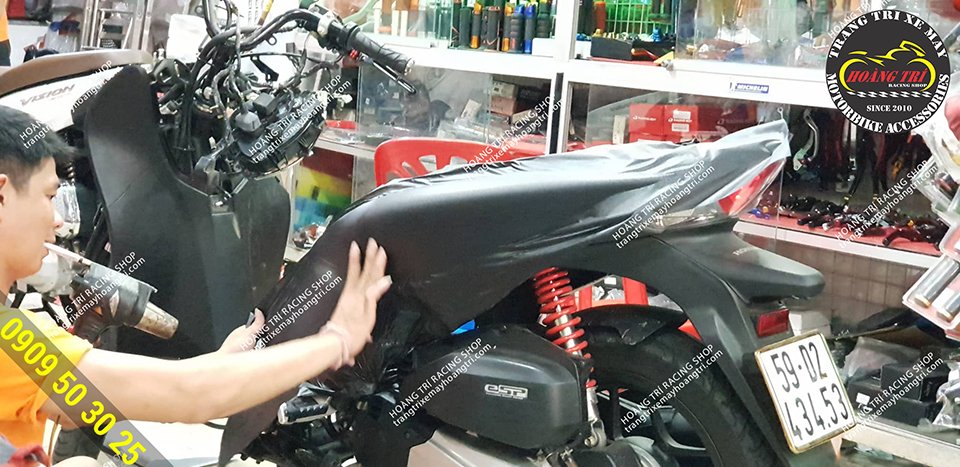 Nhân viên đang dán decal đổi màu xe cho chiếc SH Mode màu đỏ