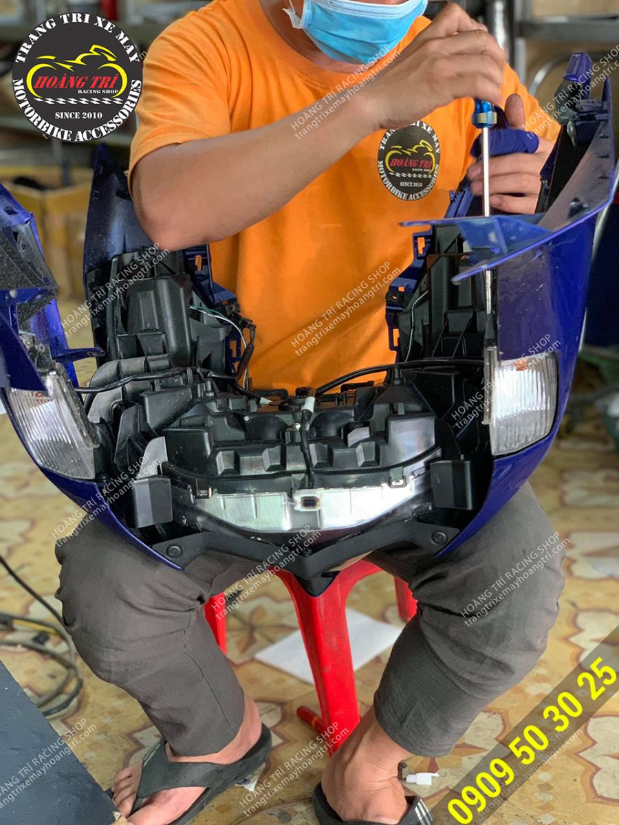 Nhân viên đang lắp đặt mạch tăng sáng cho đèn pha