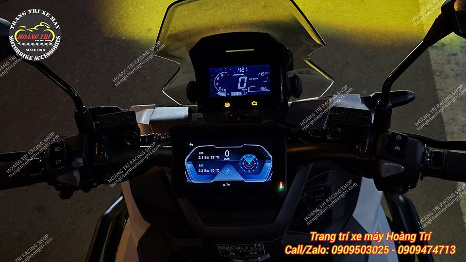 Màn hình thể hiện đồng hồ xe ADV 160 với thông số áp suất lốp được hiển thị
